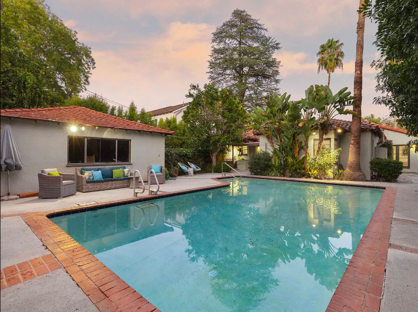Situated on a beautiful tree-lined street in Studio City, this Spanish home built in the 1930s has had much of its original character preserved. Enjoy charming details such as tray ceilings, large bay windows and quaint built-in features throughout. The remodeled galley kitchen features stainless steel appliances and a cozy breakfast nook. Two generously sized bedrooms are separated by the primary bathroom, the larger of which comes with a walk-in closet. The family room sits at the back of the house and has french doors that open to a covered patio. Surrounded by mature landscaping, the backyard oasis offers the utmost privacy and is the perfect spot to relax or take a dip in the sparkling pool.